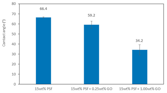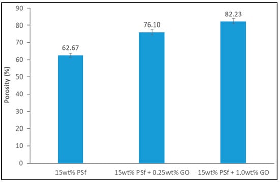 The membranes’ porosity was calculated using the dry-wet weight method. The porosity was observed to increase with an increase in GO concentration (Figure 3). The hydrophilicity effect of GO expedited the exchange of solvent/non-solvent during the phase inversion process, which led to higher membrane porosity. A similar observation was reported by Wang et al. [15] with PVDF membranes being blended with GO.