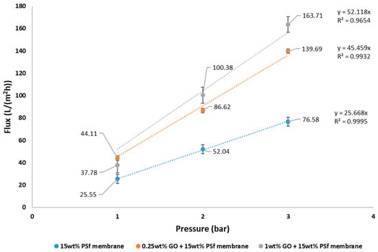 The pure water flux of the prepared membranes at different pressures is shown in Figure 4. It can be observed from the graph that the flux increased with GO concentration in the membrane. The membrane having 1 wt % GO had a maximum flux of 163.71 L/m2 h at 3 bars. At 1 bar, 1 wt % GO had a lower flux than the 0.25 wt % GO. This may be due to the higher concentration of GO constricting the pores. Increase in flux with GO concentrations for PVDF ultrafiltration membranes have also been reported by Wang et al. [15]. The permeability of the membranes was also observed to increase with the addition of GO. The permeability was estimated at 25.7, 45.5, and 52.1 L/m2 h bar for 15 wt % PSf, 15 wt % PSf–0.25 wt % GO, and 15 wt % PSf–1 wt % GO, respectively (Figure 4.). The increase in permeability was due to the presence of GO favoring the solvent and non-solvent de-mixing.