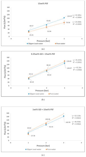 Pure water flux and 50 mg/L lead flux of (a) 15 wt % polysulfone (PSf); (b) 0.25 wt % graphene oxide (GO) and 15 wt % PSf; and (c) 1 wt % GO and 15 wt % PSf.