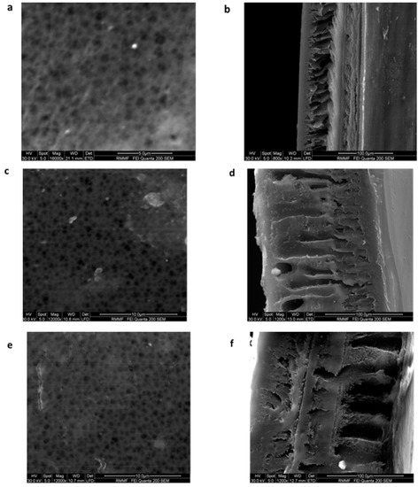 Environmental Scanning Electron Microscopy (ESEM) images of surface ((a)—mag 16,000×, (c)—mag 12,000× and (e)—mag 12,000×) and cross sections ((b)—800×, (d)—1200× and (f)—1200×) of membranes having compositions 15 wt % PSf (a,b), 15 wt % PSf–0.25 wt % GO (c,d), and 15 wt % PSf–1 wt % GO (e,f), respectively.