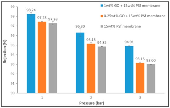 From the figure, it can be noted that higher rejection was achieved with the 1 wt % GO membrane at 1 bar of pressure. All membranes demonstrated a decrease in rejection when there was an increase in pressure, which can be attributed to the increase in water permeation which facilitated the convection of lead ions through the membrane pores.