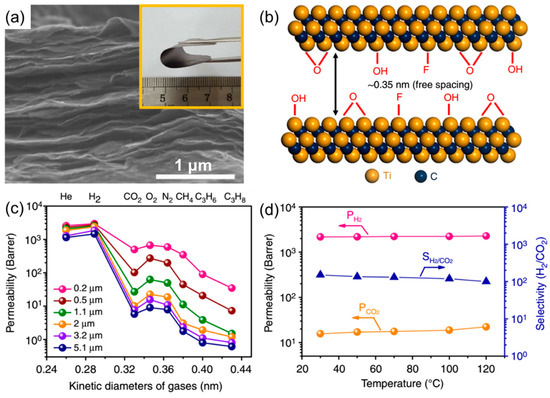 Figure 7a shows an MXene membrane prepared by vacuum filtration of Ti3C2TX nanosheets on an AAO support. Ti3C2TX nanosheets were fabricated by selectively etching Al from the Ti3AlC2 phase using hydrochloric acid and lithium fluoride [30]. The nanochannels between the nanosheets are estimated to be 0.35 nm (Figure 7b), which is desirable for gas separation. Figure 7c demonstrates an unexpected behavior, i.e., gas permeability decreased with increasing the film thickness, presumably because the thin MXene layers (<2 μm) contain defects, and the defects decreased with increasing thicknesses. Figure 7d shows that a 2-μm-thick MXene membrane showed both high H2 permeability (~2000 Barrers) and high H2/CO2 selectivity (>100) at 30–120 °C, which is comparable with the best GO membranes reported so far [27].