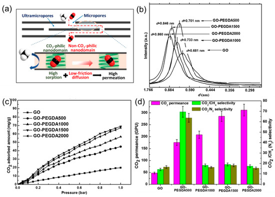 GO membranes usually show low CO2 permeability, which limits their applications for CO2 capture. On the other hand, GO layers can be intercalated with CO2–philic materials to facilitate CO2 transport, such as polyethylenimine [24], borate [33], poly(ethylene glycol) diamines (PEGDA) [34], ionic liquids [35], and piperazine [36]. Figure 8a presents the intercalation of GO sheets using PEGDA, whose amine groups react with the epoxy groups on the surface of GO sheets, forming CO2-philic nanodomains [34]. The intercalation increased the size of the GO nanochannels (Figure 8b), and the CO2 sorption (Figure 8c). For instance, the GO-PEGDA2000 absorbed about 3 times more CO2 than the pristine GO, and it exhibited a CO2 permeance of 300 GPU, which is ~5 times higher than that of the pristine GO membrane (47 GPU). The GO-PEGDA500 shows a CO2/CH4 selectivity of ~70, which is much higher than the GO membrane (14). As shown in Figure 8d, the CO2 permeance increased with increasing PEGDA molecular weight presumably because of the enlarged channel size. On the other hand, the highest CO2/CH4 and CO2/N2 selectivity is achieved by GO-PEGDA500 membranes because of their proper channel size (~0.35 nm), which is right between the kinetic diameter of CO2 (0.33 nm) and CH4 (0.38 nm) or N2 (0.364 nm).