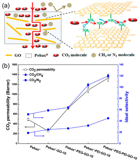 To further enhance the CO2 transport, the GO nanosheets can be grafted with CO2-philic PEG and PEI and then embedded into PEBA (Figure 10a) [40]. As shown in Figure 10b, incorporating 10 wt% GO in PEBA improved CO2/gas selectivity and reduced CO2 permeability. However, embedding PEG-modified GO (PEG-GO), PEI-modified GO (PEI-GO) or PEG and PEI modified GO (PEG-PEI-GO) improved both CO2/gas selectivity and CO2 permeability. For example, an MMM containing 10 wt% PEG-PEI-GO exhibited an ideal CO2/N2 selectivity of 120, CO2/CH4 selectivity of 45, and CO2 permeability of 1330 Barrers, which is much higher than PEBA.