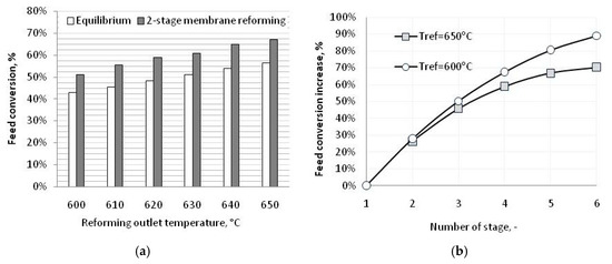 (a) Feed conversion for different reforming outlet temperatures (P = 10 barg, Steam/Carbon ratio S/C = 4.3 mol; Tmem = 410–420 °C, Amem = 0.4 m2, Molar sweep gas/feed ratio = 0); (b) Multistage membrane steam reforming performance (P = 10 barg, S/C 4.3, Tmem = 410–420 °C, Amem = 0.4 m2, Molar Sweep gas/feed ratio = 0).