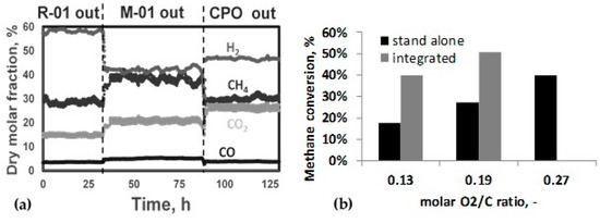 Figure 7a shows the product composition on a dry basis at steady-state conditions measured at the outlet of reformer, the membrane separation, and the CPO reactor, respectively. The data were collected when operating the reformer at an outlet temperature of 590 °C, P = 11 atm, with a hydrogen Recovery Factor (HRF) of 45% and with a ratio O2/(CO + CH4) at the inlet of the CPO reactor of 0.16. The oxygen to carbon ratio was evaluated by taking into account the carbon contribution of CO and CH4 in the retentate stream.