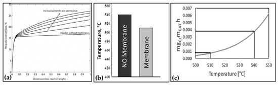 The results reported in Figure 8b show the temperature at which it was possible to reach a propane conversion of 10% without and with the membrane. In particular, in the absence of the membrane, it was necessary to reach 540 °C to achieve such conversion level. This temperature decreased of about 30 °C when a membrane reactor was used. This achievement could be translated into a lower deposition of carbon matter on the catalytic bed. Indeed, under the assumption of a deactivating model for the catalyst, developed on the basis of the experimental results achieved, it was possible to evaluate that the coke deposited was reduced five times when the membrane was applied (Figure 8c).