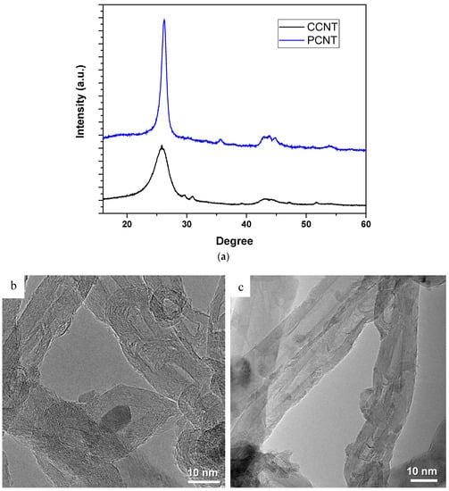 In order to characterize the morphology and structure of the produced and commercial CNTs, TEM analysis was conducted and depicted in Figure 1b,c which shows the TEM images of produced and commercial CNTs (PCNTs and CCNTs, respectively). As it is sown in Figure 1b,c, the CCNTs are highly entangled and non-uniform with presence of some major defects on their wall. The average size of CCNTs seen from TEM image in Figure 1b is in range of 20–30 nm. On the other hand, Figure 1c shows the TEM image of PCNTs which are highly uniform, highly ordered, and crystalline and no major deformation or defect on their wall can be seen. The average size of PCNT estimated from TEM image is in the range of 10–20 nm.