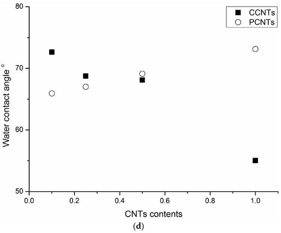 The surface hydrophilicity of the PS/CNTs nanocomposite membranes was found to be affected by the addition of CNTs. Figure 1d displays water contact angle (WCA) of PS/CNTs nanocomposite membranes as a function of CNTs content.