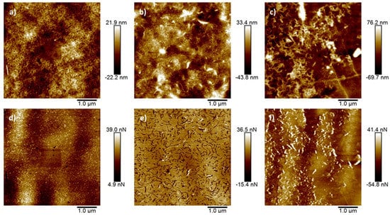 AFM images of PS membranes: (a) height image of pristine PS (root mean square roughness (Rq) for this image = 6.47 nm); (b) PS with commercial CNTs (Rq = 12.9 nm); (c) PS with produced CNTs (Rq = 25.6 nm); (d) adhesion map of pristine PS obtained simultaneously with image (a); (e) adhesion map of PS with commercial CNTS corresponding to (b); (f) adhesion map of PS with produced CNTs corresponding to (c).