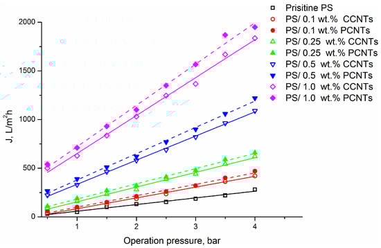 Water fluxes of PS and PS/CNTs nanocomposite membranes at different CNTs loading versus operating pressure.