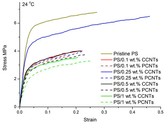 Engineering stress–strain curves of PS nanocomposite membranes with different contents of CCNTs or PCNTs at room temperature and at an initial strain rate of 0.17/s.