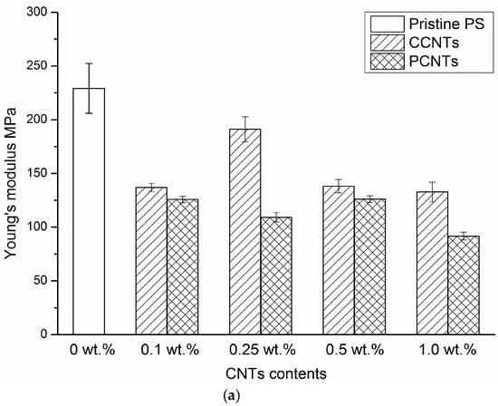 Figure 5a shows the engineering stress–strain curves of PS nanocomposite membranes with different content of CCNTs or PCNTs at room temperature and at an initial strain rate of 0.17/s. The extracted mechanical parameters such as Young’s modulus, yield stress, and elongation at fracture are shown in Figure 6a–c and summarized in Table 3. In Figure 5, the tensile behaviors of all the PS/CNTs nanocomposite membranes exhibited three stages: linear elasticity, nonlinear transition to yield, and post-yield strain hardening. Pristine PS membrane had the highest tensile strength, as characterized by a Young’s modulus of 229 MPa, a yield stress of 5.8 MPa and a fracture strain of 0.27. With the addition of 0.1 wt. % CCNTs or PCNTs, the mechanical properties of the PS/CNTs nanocomposite membranes significantly decreased. For example, the Young’s modulus decreased from 229 MPa for pristine PS membrane to 137 MPa for PS/0.1 wt. % CCNTs membrane, representing a decrease of 40.2%. The yield stress decreased from 5.8 MPa for pristine PS membrane to 3.0 MPa for PS/0.1 wt. % CCNTs membrane, representing a decrease of 48.3%. However, with the addition of 0.25 wt. % CCNTs, the tensile properties of the membrane increased compared with those of PS/0.1 wt. % CCNT nanocomposite membrane. The Young’s modulus of PS/0.25 wt. % CCNT membrane had a decrease of 16.6% but its elongation at fracture had a significant increase of 70.4% compared with the pristine PS membrane. With increasing CCNT or PCNT content (0.5 wt. % and 1.0 wt. %), the mechanical properties of the membranes decreased again compared with those of PS/0.25 wt. % CCNT membrane. Note that the Young’s modulus and yield stress of the membranes with CCNT were slightly higher than those of the membranes with the PCNTs for a given CNT content, except for the membranes with 0.25 wt. % CNTs. More specifically, the magnitude of the mechanical properties of the PS/0.25 wt. % CCNTs were much higher than those of the PS/0.25 wt. % PCNT nanocomposite membranes.