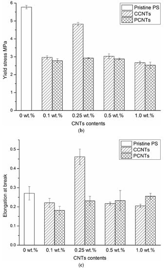 Young’s modulus (a), yield stress (b), and elongation at break (c) of PS nanocomposite membranes with different contents of CCNTs and PCNTs at room temperature at an initial strain rate of 0.17/s.