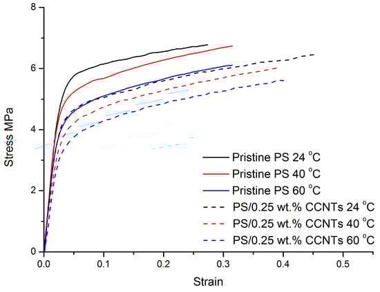 Engineering stress–strain curves of pristine PS membranes and PS/0.25 wt. % CCNT nanocomposite membranes at different temperatures and at the initial strain rate of 0.17/s are shown in Figure 7. In these curves, the effect of temperature can be observed for pristine PS membranes and PS/0.25 wt. % CCNTs nanocomposite membranes. It can be seen that the Young’s modulus and yield stress decreased with increasing temperatures. However, the impact of temperature on the post-yield behaviors and on the fracture strains of the pristine PS membranes and PS/0.25 wt. % CCNT nanocomposite membranes was limited. All the curves show similar post-yield strain-hardening slope. The fracture strain for pristine PS membranes at 40 °C and 60 °C were slightly higher than that at 24 °C, whereas the fracture strain for PS/0.25 wt. % CCNT nanocomposite membranes at 40 °C and 60 °C were slightly lower than that at 24 °C.