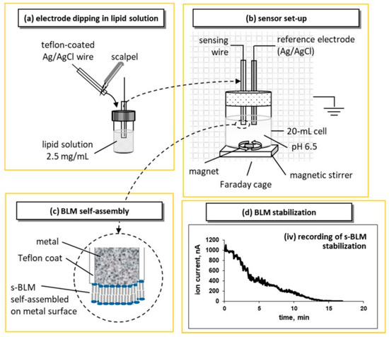Representation of the device setup, and the lipid self-assembly process for the preparation of metal-supported stabilized bilayer lipid membranes (sBLMs; not drawn to scale) based on the original idea of [2]: (a) the tip of the sensing electrode is cut with a scalpel and immediately dipped in lipid solution before transferred in the electrolyte solution. (b) The electrochemical setup uses a two-electrode configuration (i.e., the sensing electrode and a Ag/AgCl reference electrode) in a magnetically stirred 20 mL cell. The set-up is placed in a grounded Faraday cage; 25 mV external DC potential is applied between the electrodes; the ionic current through the BLM is measured with a digital electrometer. (c) Upon immersion, the lipid drop attached to the tip of the wire is self-assembled into a bilayer; one layer is adsorbed on the metal surface and the other faces the electrolyte. (d) Recording of the ion current decrease during the self-assembly process. The recording starts with the immersion of the sensing electrode in the electrolyte solution (reprinted from Reference [13]).