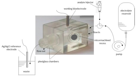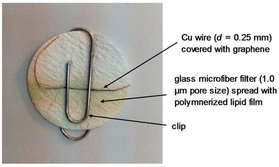 Stabilized lipid films were constructed as described in [10,11] which was previously described. The enzyme, antibody or receptor (“receptor”) was incorporated in these lipid membranes prior to polymerization by spreading 15 µL of the “receptor” suspension over the polymerization mixture. The polymerized lipid membrane was mounted onto the copper wire containing graphene nanosheets to produce the nanosensor. Figure 4 and Figure 5 show a diagram of the experimental set-up used in these previous works.