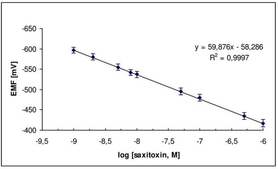 A potentiometric saxitoxin device which was based on graphene with a lipid membrane and in which anti-STX (which is the natural saxitoxin receptor) was immobilized was recently reported in the literature [24]. An excellent selectivity and sensitivity for the determination of saxitoxin, rapid times of response (about 5–20 min), and detection limits of 1 nM were noticed. The construction of this biosensor was easy; the sensor exhibited good reproducibility, reusability and adequate storage stability with a slope of about 60 mV/decade, as shown in Figure 8. The method was evaluated and validated in lake water and shellfish samples.