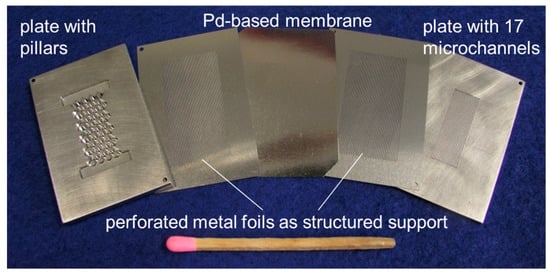 - Boeltken, T.; Belimov, M.; Pfeifer, P.; Peters, T.A.; Bredesen, R.; Dittmeyer, R. Fabrication and testing of a planar microstructured concept module with integrated palladium membranes. Chem. Eng. Process. 2013, 67, 136–147. [Google Scholar] [CrossRef]