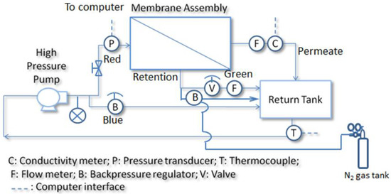 A custom-built filtration system was used to characterize desalination performance of 100-fiber PBI HF modules and its process flow diagram (PFD) is shown in Figure 3. A solution of 2000 ppm single salt (i.e., MgSO4 CaCl2, Na2SO4 or NaCl) was circulated in the system at a flow rate of 1 gallon per hour (GPH) and under a hydraulic pressure of 100–700 psi (6.9–48.3 bar). The solution temperature was stabilized at 25 ± 2 °C by a recirculating chiller (Thermo Neslab RTE-110, Thermo Fisher, Waltham, MA, USA). The pH value of the feed solution was adjusted using a 1 M NaOH or 1M HCl aqueous solution and monitored by a pH meter (PerpHecT LogR Orion 370, Thermo Scientific, Waltham, MA, USA). The PBI HF modules were equilibrated under a specific condition for 2 h before data collection. Permeate flux and conductivity were measured every 10 min using a 50-mL graduated cylinder and a conductivity meter (CON 110, Oakton Instruments, Vernon Hills, IL, USA), respectively. Salt rejection R (%) was calculated using the following equation: