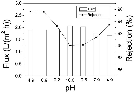 The desalination performance of PBI HF was sensitive to pH of the feed solution because the N-H functional groups in the imidazole ring have a lone pair on the nitrogen that acts as a proton acceptor. In an aqueous solution, the PBI membrane surface tends to be positively charged [5,31], and its rejection of salt is enhanced because it repels cations in the solution due to the Donnan exclusion effect. As is shown in Figure 9, the PBI HF rejects NaCl above 95% when the pH value is lower than 7. The surface-charge density is decreased when the solution becomes more basic because of the equilibrium for the ionization of the PBI N-H functional group in aqueous solution. Therefore, the salt rejection falls to 90% at pH 10. Because the surface-charge process is reversible, the PBI HF salt rejection improves when the pH is falls. The PBI HF has a good chemical resistance and works well in extremely acidic or basic aqueous solutions. The OH− or H+ are smaller than salt ions, so the salt rejection deteriorates with overdoses of OH- or H+ in the solution [32]. Therefore, the usefulness of varying the solution pH value is limited in the 4.9–10 range.