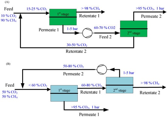 Large conventional gas fields are becoming less accessible, which has leads to the need for embracing more challenging gas resources containing high CO2 and H2S [24]. CO2 content in natural gas is very much dependent on the fields and will usually increase as time passes. Natural gas with higher CO2 content are more challenging to process with conventional amine absorption due to the requirement of larger columns and higher energy consumption. However, membrane systems show a great flexibility to tolerate the variations in feed CO2 content, which is particularly relevant for enhanced gas recovery where CO2 content in the produced natural gas changes over time. Moreover, membrane technology would be beneficial for offshore platform operations due to its small footprint and low energy consumption. Process design is essential to provide an energy-efficient membrane technology for natural gas sweetening. Two-stage membrane systems have been previously reported for CO2 removal from natural gas using FSC membranes [21,24], and recycling in the second stage is required to achieve a low methane loss. Therefore, two membrane processes, illustrated in Figure 1, are required for natural gas sweetening with different feed CO2 content to achieve the separation requirements. Sweet natural gas with high CH4 purity (>98 vol.%) is produced in the first-stage retentate stream for natural gas with a low CO2 content (e.g., 10 vol.%), as shown in Figure 1A. Recycling of retentate stream in the second stage can achieve a low CH4 loss (<2%). For natural gas with high CO2 content (e.g., 50 vol.%), high-purity sweet natural gas can only be produced in the second-stage retentate stream, as indicated in Figure 1B. The recycling of the second-stage permeate can secure a low methane loss.