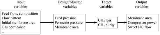 The performance of carbon membranes reported in a previous work [17] was used as the simulation input in this study. It is worth noting that gas permeance and selectivity are pressure-dependent, as described in Table 1 (membrane performance at different pressure was predicted based on the model fitted to the experimental data), which provides a more accurate evaluation on technology feasibility. Two simulation scenarios with various feed composition, feed pressure (pF), and permeate pressure (pP), listed in Table 2, were conducted by HYSYS integrated with ChemBrane (in-house membrane module [25]). The detailed membrane model has been described in a previous work [17]. The simulation workflow of hollow fiber carbon membrane systems for CO2 removal from natural gas in HYSYS is illustrated in Figure 2, which also outlines the input variables (e.g., flow pattern, initial membrane area, feed flow, etc.). The design variables—feed and permeate pressures—were investigated to document their influence on gas processing cost. Membrane area was adjusted to achieve the target variables, i.e., CH4 purity and CH4 loss in the first and second stage, respectively. The output variables—required membrane area, compressor power demand, and sweet NG flow—were used for cost evaluation. High feed pressures of 50–90 bar were investigated in the process simulations. Two-stage carbon membrane systems were designed to evaluate the technology feasibility of carbon membrane systems for CO2 removal from a 50,000 m3(STP)/h natural gas plant (with 10 and 50 vol.% CO2 in feed) at 30 °C. The CH4 purity of >98 vol.% and CH4 loss of <2% were defined as the separation targets.