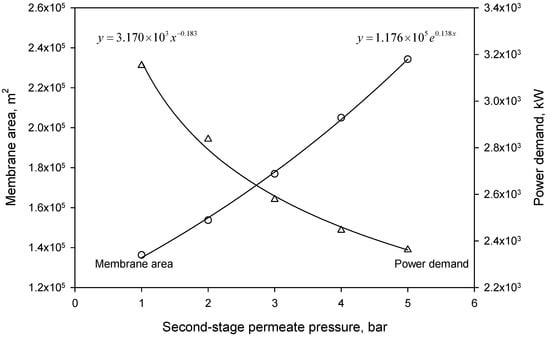 Dependence of required membrane area and power demand on the second-stage permeate pressure.