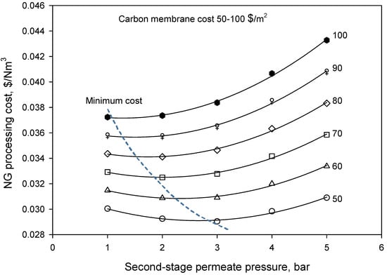 In order to identify the optimal permeate pressure in the second stage, cost estimation was performed based on Equation (5), and the results are shown in Figure 4. It was found that the minimum NG processing costs at different second-stage permeate pressures were dependent on the membrane cost. Compared to the FSC membranes for natural gas sweetening reported in a previous work [24], the investigated carbon membrane system presented a higher NG processing cost, as listed in Table 4. However, it should be noted that a much higher pressure of 50 bar was simulated for the carbon membranes compared to the FSC membrane system of 20 bar. Moreover, fixed gas permeance was used for the FSC membranes at difference pressures, which most likely does not exist in a real system. In addition, the specific required membrane area for the carbon membranes was found to be much larger compared to the FSC membranes due to a much lower gas permeance of the carbon membranes. Therefore, future work on improving gas permeance of carbon membrane is significantly required to increase its competitiveness for natural gas sweetening.