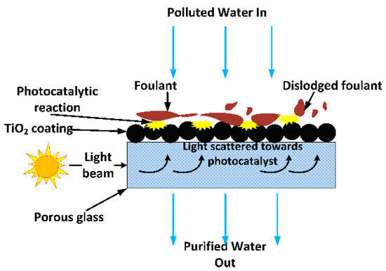 In-situ self-cleaning methods are therefore necessary to solve the fouling problem without stopping the water filtration process. One such method is coupling membrane filtration with photocatalysis. The photocatalytic properties of semiconductor photocatalysts such as TiO2 lead to the photo-induced partial or total decomposition of pollutants present on the surface of the membrane while photo-induced ultra-hydrophilicity leads to elimination of the remaining hydrophobic contaminants through a simple water rinsing operation. Photocatalysis and induced hydrophilicity can occur on the same surface simultaneously to give a “self-cleaning” membrane which leads to savings on cleaning procedures [5,6].