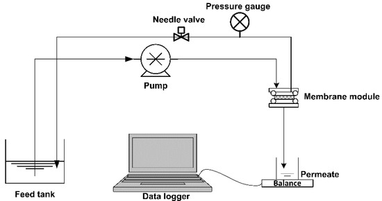 A 20 mg/L HA solution prepared by the appropriate dilution of a previously prepared stock solution was used as the feed. Generally, the concentration range of humic substances in surface and ground water is 20 μg/L–30 mg/L [12]; therefore, 20 mg/L was specifically chosen to fall within the upper region of this range to represent a more challenging wastewater where there is a stronger need for membrane cleaning. To prepare the stock solution, 6 g of HA was mixed in 2 L of deionized water over 2 days by aid of a magnetic stirrer. Suspended solids were removed by vacuum filtration through a 0.45 µm membrane filter (ADVANTEC, Tokyo, Japan). The filtration setup is depicted in Figure 2, and it consisted of a feed tank, a peristaltic pump, membrane module, needle to close the retentate line such that the filtration mode was dead-end, pressure transducer to measure the change in transmembrane pressure (TMP), and a permeate collection tank placed on a balance connected to a data logger. The experiments were carried out at a constant flux of 450 L m−2 h−1. The membrane was first compacted with simulated tap water (100 mg/L NaCl solution) for 30 min, followed by filtration of the 20 mg/L HA solution for 30 min. Simulated tap water was used instead of real tap water so that the actual composition of the water was known, controllable and replicable. The membrane was then removed from the module and cleaned by either UV exposure under the lamp for 30 min, chemical cleaning using a 1% NaOH solution and 0.5% NaOCl, or simple rinsing in distilled water. After the cleaning process, the membranes were reloaded onto the module and the membrane recovery determined by measuring the new TMPs while continuing HA filtration for 30 min, cleaning and another HA filtration cycle. The cleaning methods used are summarised in Table 2.