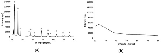 The average pore size of the substrate as measured by porometry was 1.4 µm. After coating with TiO2, the normalized weight of the coating was measured on the membranes to be 4 ± 0.2 mg/cm2. The results of the XRD analysis of the photocatalyst and substrate are shown in Figure 3.