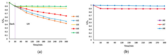 Dye concentration over time (a) in the presence of ultraviolet (UV); over the active layer (A1), through the substrate (A2), reflected (A3), through the substrate but reflection eliminated (A4), uncoated membrane (A5). (b) Adsorption by coated membrane (A6), adsorption by uncoated membrane (A7) and photolysis (A8).