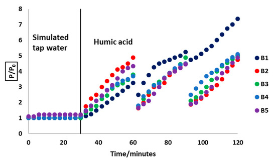 Figure 6 shows the relative pressure change over the course of filtration of HA and simulated tap water. At the initial stage of simulated tap water filtration, there are no significant pressure changes due to the absence of foulants. The observed TMP is necessary to overcome the intrinsic membrane resistance. The value of P0 was 13 ± 2 kPa for the membranes. As soon as the feed is changed to a HA at 30 min, the TMP starts to rise due to fouling on the membrane surface. When there is no cleaning of the membrane that is carried out (B1), there is only a small pressure relief when the system is opened at 60 and 90 min. However, as soon as the filtration is restarted, the TMP quickly rises to values that are higher than before the system opening event. By the end of the 120 min filtration period, the TMP in B1 rises by more than 700% since the start of the filtration process. In contrast, cleaning the membrane by exposing the active layer to UV (B2) resulted in significant restoration of the membrane such that the final TMP is about 500% of the initial. This is also the case with UV exposure through the substrate (B3) and chemical cleaning (B5). Rinsing the membrane in DI water (B4) was the least effective in membrane regeneration. It is suggested that HA molecules penetrate the membrane pores, making it impossible to remove by simple water rinsing [23]; therefore, methods which breakdown the HA molecules would be more effective in mitigating fouling. Each UV cleaning step brings the TMP very close to the initial pressure, and the pressure rise thereafter does not reach the levels seen in the case where no cleaning takes place. UV exposure thus facilitates the photocatalytic degradation of HA molecules deposited on the membrane, which helps to regenerate the membrane.