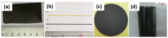 CMS membranes, in general, involve two categories: free-standing (unsupported) and supported CMS membranes (shown in Figure 1). The free-standing CMS membranes (flat film and hollow fiber in Figure 1a,b) have usually been used in lab research o the intrinsic properties of carbon membranes due to their weakness and brittleness under intensity. Supported membranes with a thin top separation layer of CMS membrane, including the flat (Figure 1c) or tube (Figure 1d) membranes, are studied for the purpose of practical application due to their high mechanical strength [13]. The gas separation performance of supported membranes is dependent on the properties of the precursor materials of the CMS membrane as the top layer on the supports.