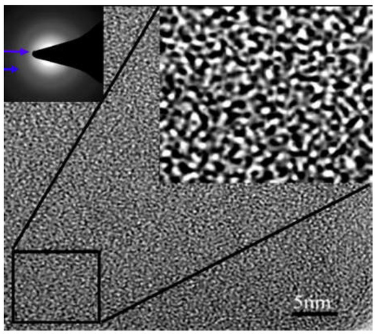 As is known, a carbon membrane has a disordered microstructure. Figure 2 shows the HRTEM (high-resolution transmission electron microscopy) image of PMDA-ODA (poly(pyromellitic dianhydride-4,4-oxydianiline))type PI-based pure CMS membrane [38]. The “white” and “black” stripes coming from different scattering and adsorption strengths of electrons imply the disordered packing of turbostratic carbon sheets and clusters, which form the porous structure of the CMS membrane. Furthermore, the crossing stripes with widths of almost 0.5 nm indicate the gas molecular diffusion routes through the disordered interconnective nano-channels with many twists and turns. The resulting high diffusion resistance of the gas molecules penetrating through the membrane is the key to low gas permeability of the pure CMS membranes [21,38,39]. Hence, reduction of gas diffusion resistance passing through the disordered pore structure of the pure carbon membrane will significantly enhance the gas permeability of carbon membranes.