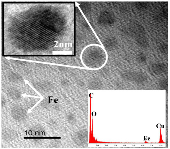 Ferrocene, a kind of organic transition metal compound with good solubility with DMAc, can form a homogeneous system with PAA solution, which helps improve the dispersion of the α-Fe obtained by the pyrolysis of ferrocene in the CMS membrane. The HRTEM image of the ferrocene/PAA based hybrid CMS membrane is shown as Figure 3. The Fe nanoparticles (identified by the EDX (energy dispersive X-ray) patterns) with diameter of almost 5 nm are dispersed homogeneously in the disordered carbon matrix. The crystal structure of Fe particles with interplanar spacing of 0.206 nm are shown in the insert image. However, the Fe element content in the hybrid CMS membrane is low because of the sublimation of ferrocene. It also could be proved by the XRD (X-ray diffraction) patterns (Figure 4) that the curve of ferrocene/PAA-based Fe/C hybrid membrane is the same as the pure CMS membrane, implying the remaining ferrocene particles, which were coated by the carbon matrix, are very few. The broad (002) diffraction peak at around 24° and (100) diffraction peak at 43° can be observed in these two CMS membranes, implying the carbon matrix presents a turbostratic structure with disordered stacked graphite microcrystals.