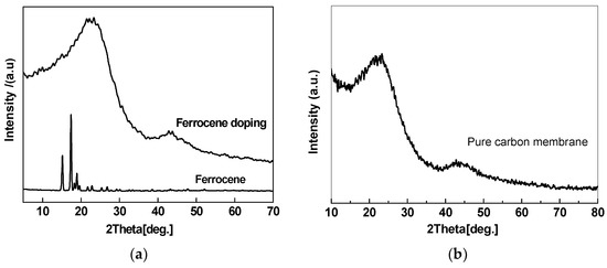 XRD patterns of ferrocene/PAA-based Fe/C hybrid membrane (a) and PAA-based pure CMS membrane (b) [63].