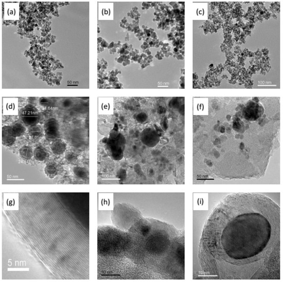 HRTEM images: Fe3O4 nanoparticles and obtained hybrid CMS membrane (a,d,g), γ-Fe2O3 nanoparticles and obtained hybrid CMS membrane (b,e,h), Zn0.5Ni0.5Fe2O4 nanoparticles and obtained hybrid CMS membrane (c,f,i) (the hybrid CMS membranes with 15% content of Fe series particles and carbonization temperature of 700 °C) [63,64,65].