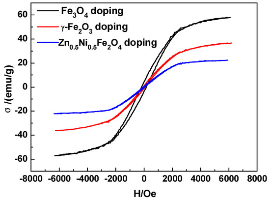 Magnetization curves of Fe series magnetic nanoparticle/C hybrid CMS membranes (content of doping Fe3O4, γ-Fe2O3 or Zn0.5Ni0.5Fe2O4 is 15 wt%) [65].