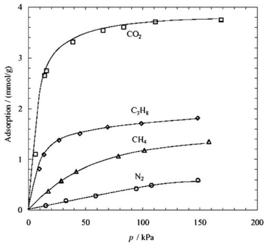 Adsorption isotherms of CO2, N2, CH4 and C3H8 measured at 25 °C on zeolite T powder [72].