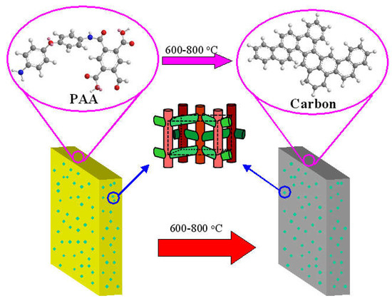 The hybrid nanoparticles were dispersed into the solvent to produce the suspension under ultrasonic treatment. The PMDA-ODA type polyamic acid (PAA) solution was mixed with the suspension. After high-speed stirring and defoaming, the obtained homogeneous precursor of hybrid CMS membrane was cast on a glass plate and dried to produce the self-standing PAA/nanoparticle hybrid membrane. The thickness of dried polymer membranes was about 100 μm. The hybrid CMS membrane was obtained by carbonizing in the tubular furnace at 600–800 °C for 2 h in flowing argon of 100 mL/min with the heating rate of 2 °C/min. The carbonization temperature of CMS membranes was 700 °C, unless otherwise specified. The thickness of CMS membranes was about 65–75 μm. The content of hybridized nanoparticles equaled the weight of nanoparticles divided by the sum of the weight of pure PAA and the weight of nanoparticles, not including the weight of DMAc (N, N-Dimethylacetamide).