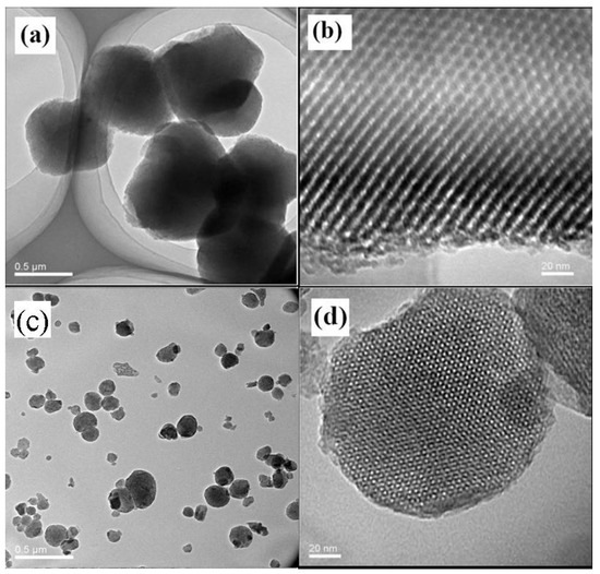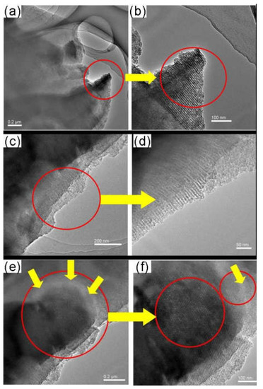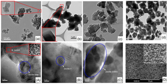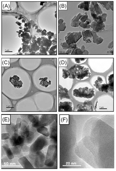 The HRTEM images of agglomerated zeolite ZSM-5 with different particle size: (A) 0.2–4 μm [59], (B) 0.2 μm [59], (C) 1 μm [59], (D) 4 μm [59], (E,F) 20–50 nm [55].