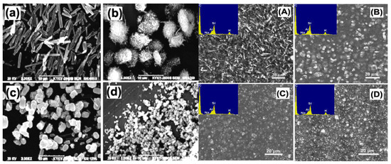 SEM images of zeolite T: (a) T-8, (b) T-6, (c) T-3, (d) T-0.5 and T/C hybrid membranes: (A) TC-8, (B) TC-6, (C) TC-3, (D) TC-0.5 [57].