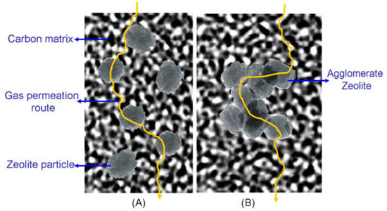 The model of the gas pathway through the zeolite/C hybrid membranes [59]. (A) well dispersed zeolite particles in the carbon matrix; (B) agglomerate zeolites in the carbon matrix.