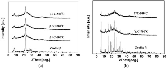 XRD patterns of zeolite β/C (a) and Y/C (b) hybrid membranes prepared at different pyrolysis temperatures [59].