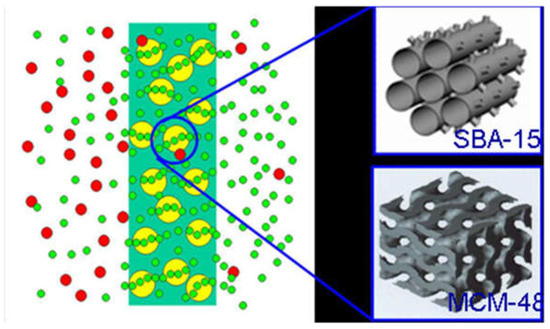 From the first aluminosilicate ordered mesoporous material, M41S [74,75], to the those that subsequently appeared, such as SBA-n, MSU series, HMS, FSM-16, MAS series, and JLU series, mesoporous materials have attracted great attention in the membrane separation, catalyst, molecular engineer, etc., fields [76,77,78,79,80,81,82,83]. These novel mesoporous materials could not only break the limits of porous range in zeolites, but also exhibit outstanding properties different from those of macroporous materials due to the quantum confinement effect, macroscopic quantum effect and dielectric confinement effect of mesoporous materials.