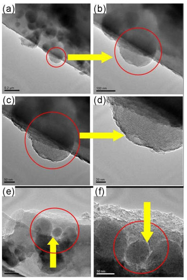As shown in Figure 5, the three kinds of Fe series nanoparticles present spherical or irregular spherical shapes. The particle size of Fe3O4 is almost 10 nm, and is 20 nm for the other two particles. In the Fe3O4/C hybrid membranes (Figure 5d,g), interfacial pores formed by the micro-phase separation function can be clearly observed between the particles and the carbon matrix. The Fe particles are surrounded by the ordered layered graphite-like carbon, which presents concentric circles with Fe particles due to the catalytic graphitized effect on the carbon matrix from Fe3O4 particles in the carbonization process. The same catalytic graphitized phenomenon exists in the Zn0.5Ni0.5Fe2O4/C hybrid membrane, but not in the γ-Fe2O3/C hybrid CMS membrane. Additionally, agglomeration happened in the Zn0.5Ni0.5Fe2O4/C or γ-Fe2O3/C hybrid CMS membrane.
