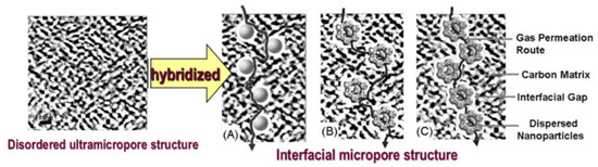 However, we believe that it is possible to improve the permeability of CMS membranes while maintaining their selectivity, which would effectively promote the practical application of CMS membranes. This is also the main purpose of this review and our research. Therefore, hybrid carbon membranes in our group were maintained with the interfacial pores that would promote gas penetration to improve permeability. The size of the interfacial pores can be changed due to the size of the doped particles and the surface chemical structure of the particles. Thus, the permeability of the hybrid CMS membranes can be adjusted accordingly.