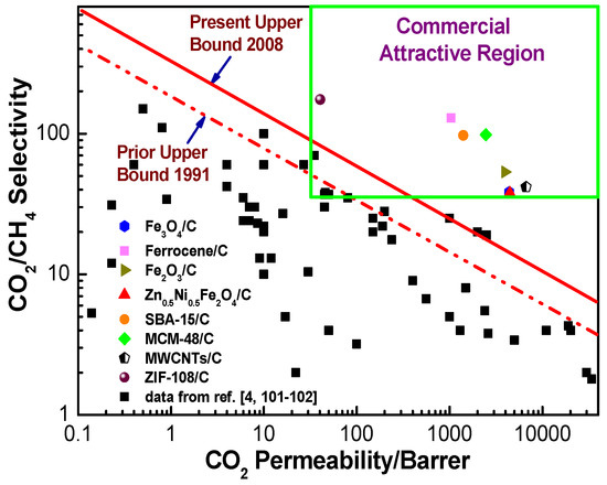Most of the literature on preparation of hybrid CMS membranes is aimed at improving selectivity and sacrificing partial permeability. Therefore, the preparation of mixed matrix membranes (precursor membranes) and hybrid CMS membranes in the literature has always tried to avoid the formation of interfacial pores to reduce selectivity. For example, the metal particle (Pt, Pd or Ni)/C hybrid CMS membranes [40,41] and the zeolite Y/C hybrid CMS membrane [52], presented a reduced CO2 permeability by more than 50% and selectivity increased by more than two times compared to the pure CMS membrane (Table 4).